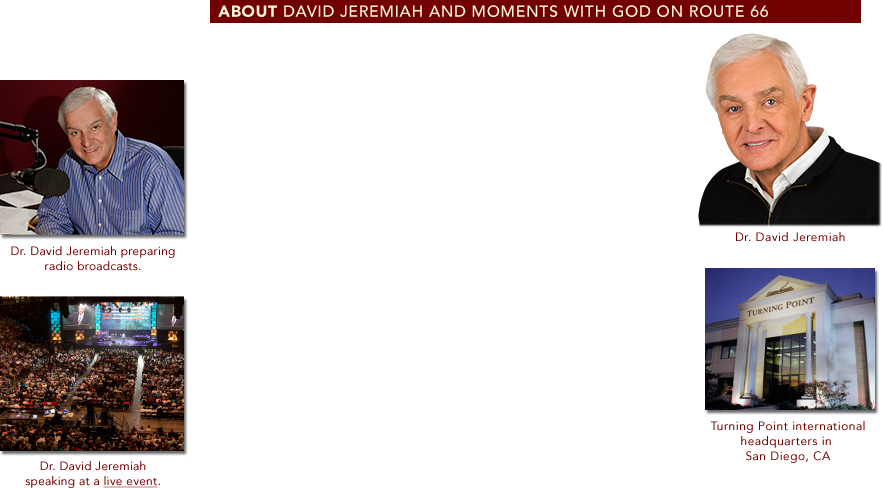 About David Jeremiah and Moments With God on Route 66 Dr. David Jeremiah preparing radio broadcasts. Dr. David Jeremiah speaking at a live event Dr. David Jeremiah Turning Point international headquarters in San Diego, CA